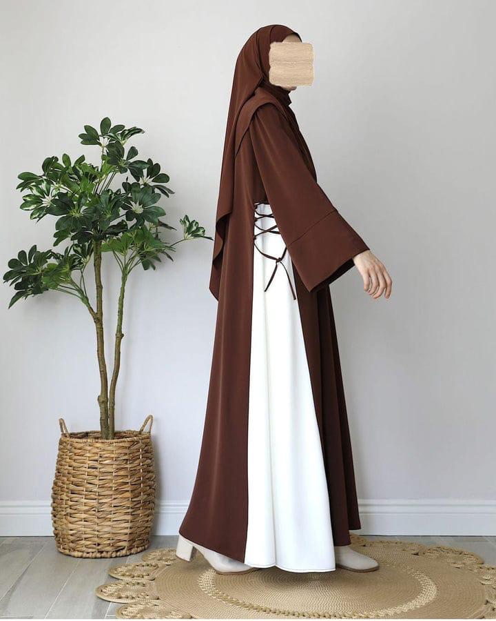 - Design: Classic Brown abaya with contrast accents on cuffs; paired with a soft grey hijab.