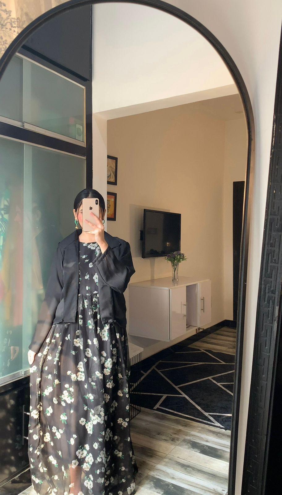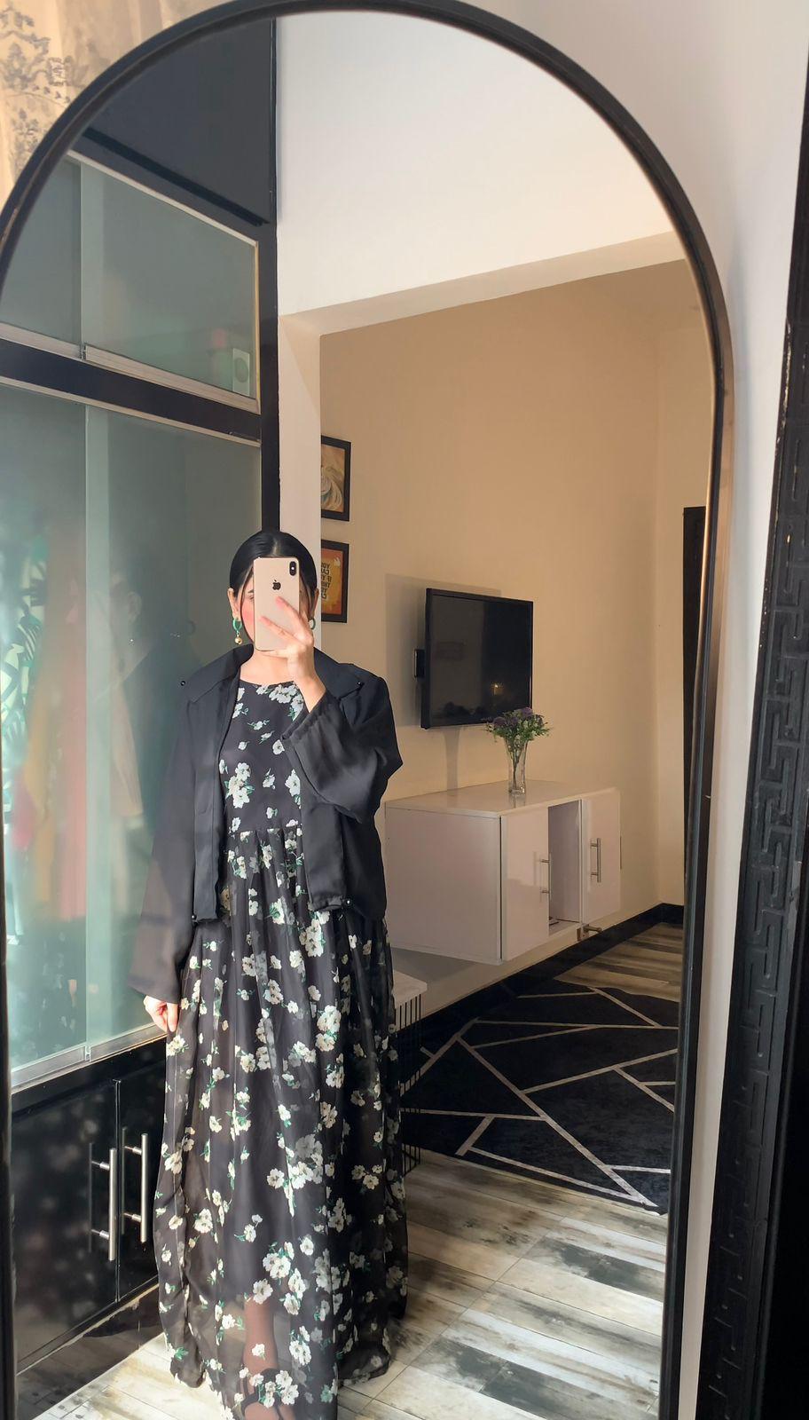 Make a bold statement with this Vibrant Abstract Maxi Dress paired with a chic cropped black Coati. Perfect for turning heads at casual outings, dinners, or creative events, this outfit seamlessly blends style and comfort.